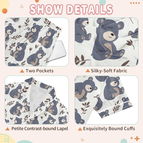 ALAZA Cute Bear Leaf Cartoon Pajamas Satin Pajama Set Short Sleeve Button Down Sleepwear 3