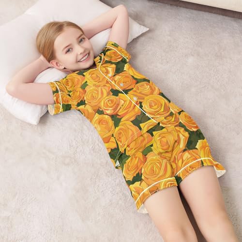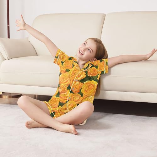 ALAZA Yellow Rose Flower Leaves Pajamas Satin Pajama Set Short Sleeve Button Down Sleepwear 1