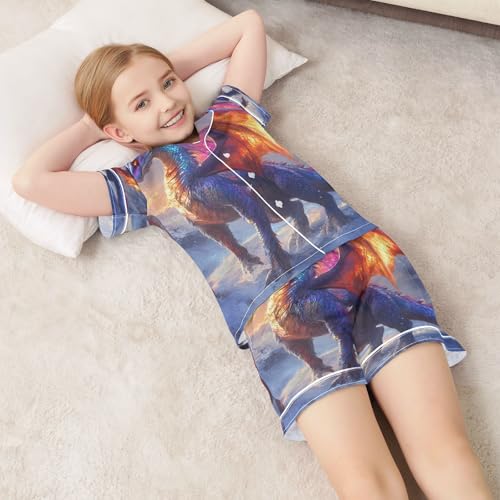 Satin Pajama Sets Short Sleeve Fantasy Dragon Button Down Silky Nightwear 2 Piece PJS 5-14Y 6