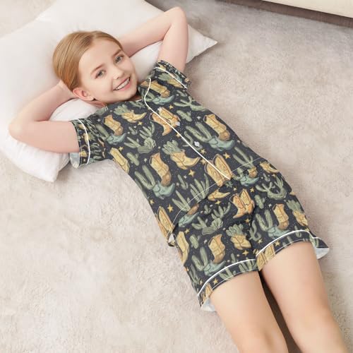 Satin Pajama Sets Short Sleeve Cowboy Boots and Cactus Pattern Button Down Silky Nightwear 2 Piece PJS 5-14Y 6