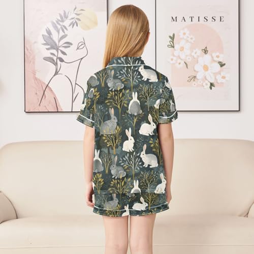 HOT ! senya Cute Rabbit Tree Satin Summer Pajama Sets Silk Short Sleeve Button Down Sleepwear