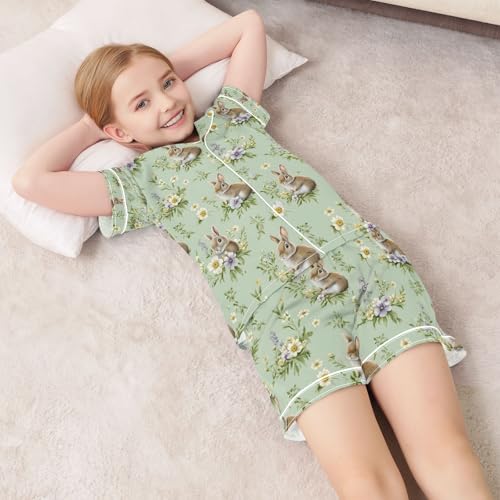 HOT ! senya Watercolor Rabbit S Satin Summer Pajama Sets Silk Short Sleeve Button Down Sleepwear
