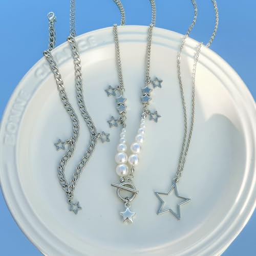 2 Pieces Silver Star Necklace Y2K Jewelry Set Grunge Necklace Kawaii Cute Necklaces Aesthetic Vintage Emo Jewelry 3
