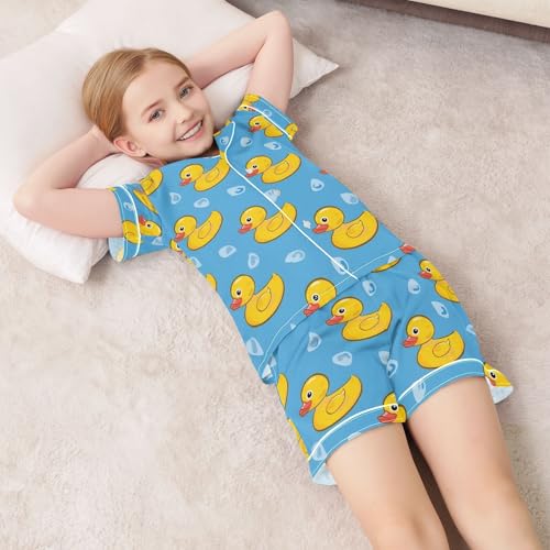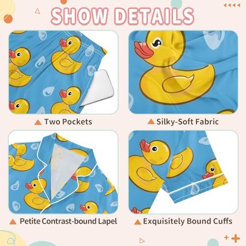 ALAZA Yellow Duck on Blue Cartoon Pajamas Satin Pajama Set Short Sleeve Button Down Sleepwear 3
