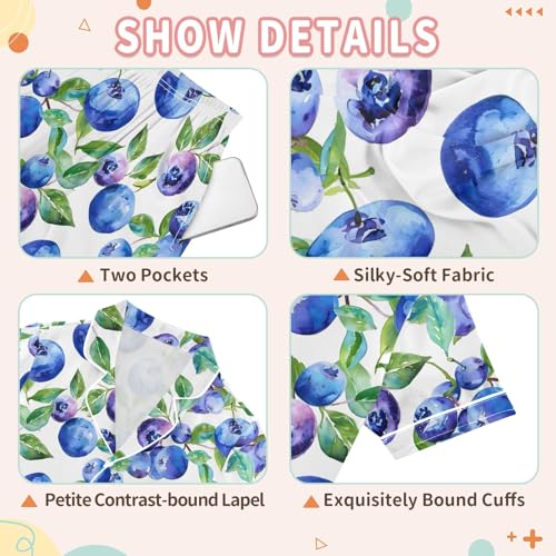 Blueberry Pattern Summer Satin Pajama Set, Cute Button-Down Sleepwear Pj Set for Sleep Wears 4