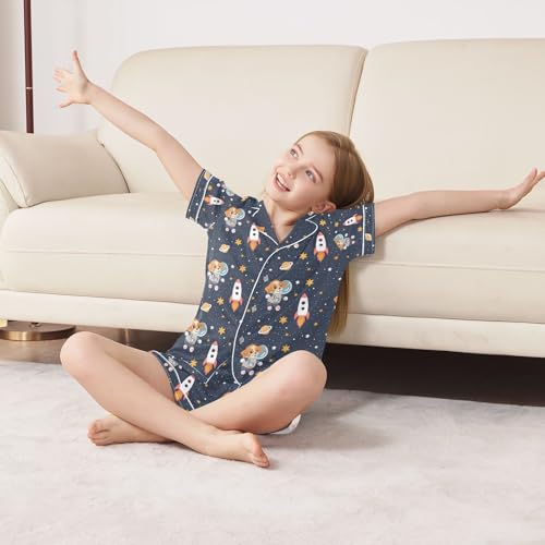 ALAZA Cute Cartoon Astronaut Dog Pajamas Satin Pajama Set Short Sleeve Button Down Sleepwear 3