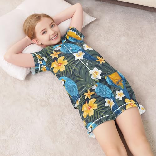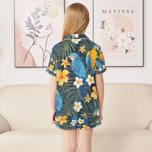HOT ! senya Parrots and Flowers Satin Summer Pajama Sets Silk Short Sleeve Button Down Sleepwear