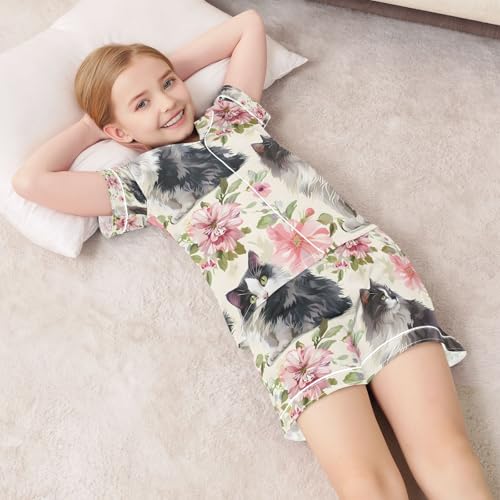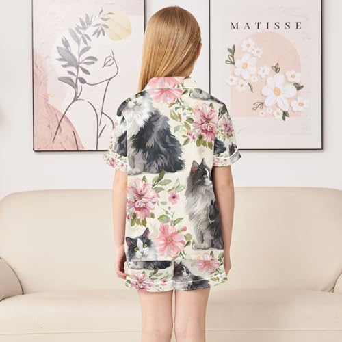 senya Flower Cat A Satin Summer Pajama Sets Silk Short Sleeve Button Down Sleepwear 1