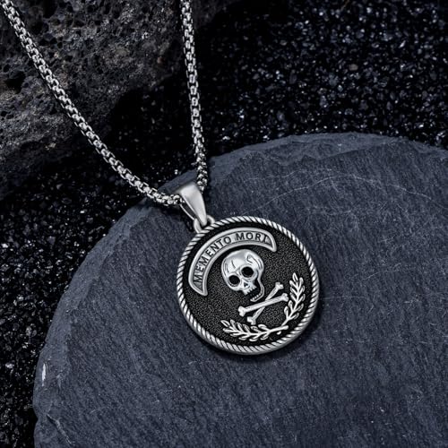 • Material: Memento Mori Necklace made of real 925 sterling silver. Stainless Steel Chain. Retro Oxidation. Hypoallergenic, lead-free, nickel-free, cadmium-free. Smooth and durable, not easy to fade, rust, tarnish, and more suitable for men or women with sensitive skin
