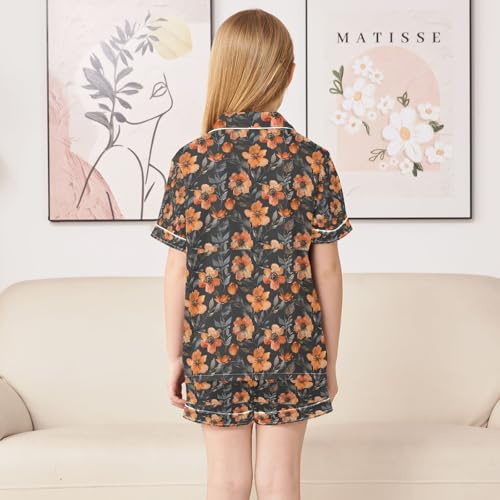 senya Orange Flower Black Satin Summer Pajama Sets Silk Short Sleeve Button Down Sleepwear 2