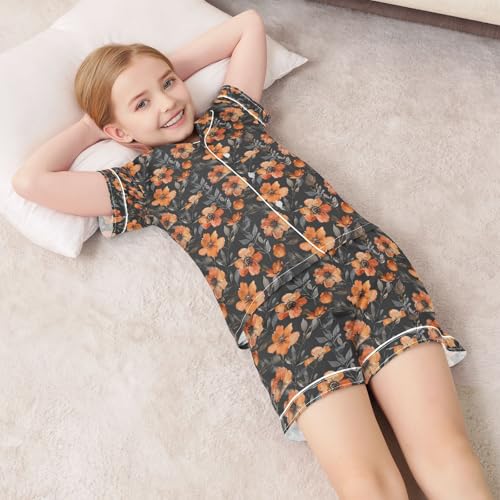 senya Orange Flower Black Satin Summer Pajama Sets Silk Short Sleeve Button Down Sleepwear 1