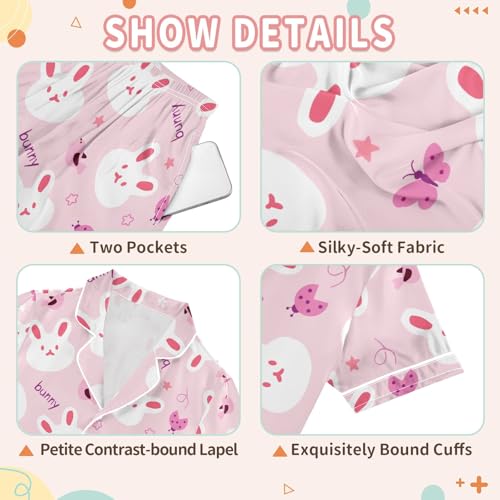 Cute Simple Bunny Pink Prints Summer Satin Pajama Set, Cute Button-Down Sleepwear Pj Set for Sleep Wears 4