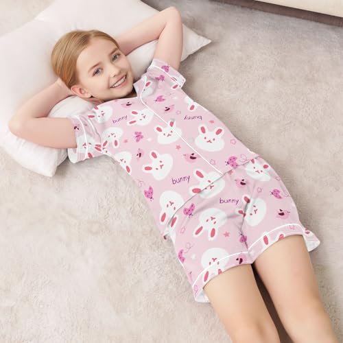 Cute Simple Bunny Pink Prints Summer Satin Pajama Set, Cute Button-Down Sleepwear Pj Set for Sleep Wears 2