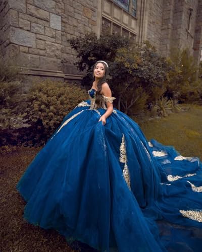 • Features: Sparkly Lace Tulle Quinceanera Dresses with Train, Off Shoulder Beaded Sweet 16 Dess, Sweetheart Gold Appliques Evening Gowns, Princess Prom Dresses for Women Plus Size. Puffy Tulle, Off Shoulder, Lace-up Back/Corset Closure, Can Easy to Adjust the Bust Size, Floor/Full Length, Fully Lined. We will make this dream prom ball gown for you!