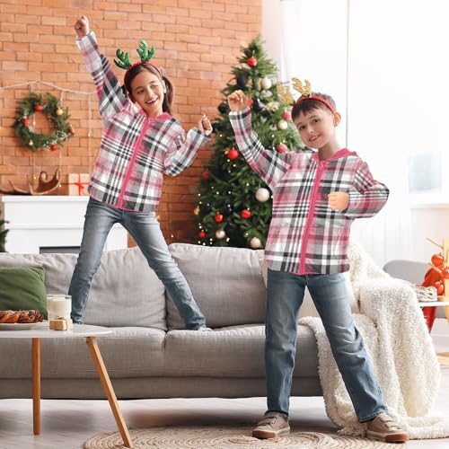 OTVEE Modern White Pink Plaid Kids Hoodie Jacket Fall Spring Full Zip Warm Outwear Coat 6