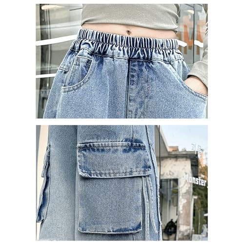 HOT ! Baggy Jeans for Girls Pockets Ripped Cargo Adjustable Waist Wide Leg Pants Streetwear Cute Jeans for Girls Washed Raw Hem