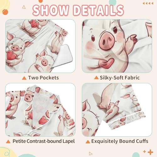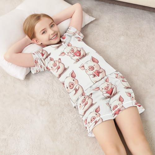 Satin Pajama Sets Short Sleeve Cute Piggy Love Pattern Button Down Silky Nightwear 2 Piece PJS 5-14Y 6