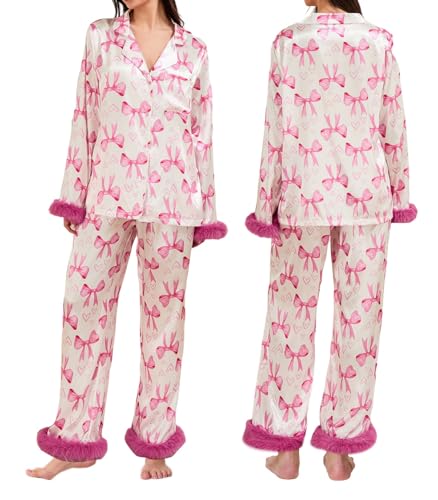 • Features: Matching Valentine's pjs for mother daughter, cute print valentine's day pajamas set, 2 piece lounge set, relaxed fit,feather trim long sleeve shirt wide leg pants, white pink silk satin pajama pjs, Sweet heart silk pjs lounge sets for women