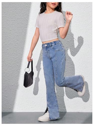 Floerns Girl's Split Hem Flare Leg Denim Pants Pearl Beaded Bell Bottom Jeans 4