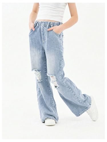 WDIRARA Girl's Elastic Waist Ripped Jeans Distressed Wide Leg Denim Pants 4