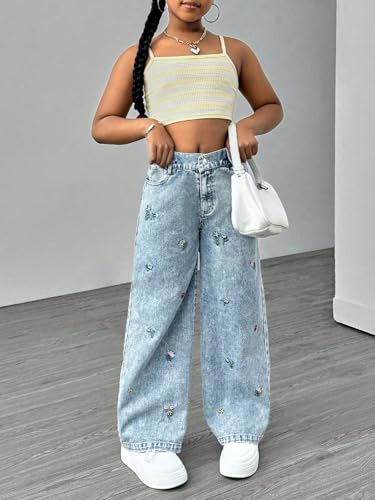 Milumia Girl's Floral Embroidery High Waist Denim Pants Straight Leg Loose Cute Jeans 5