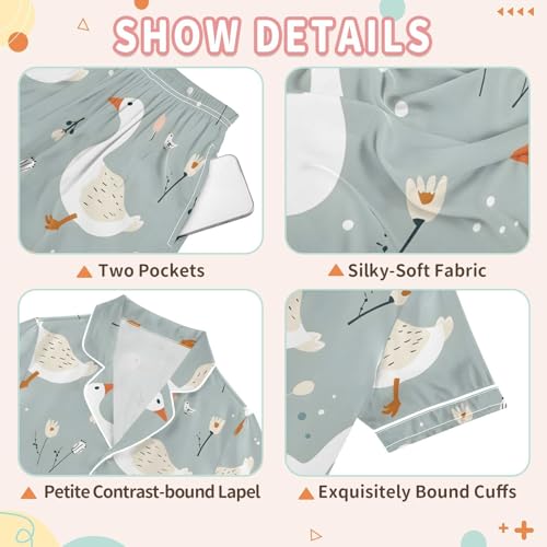 ALAZA White Duck Leaf Blossom Flower Pajamas Satin Pajama Set Short Sleeve Button Down Sleepwear 4