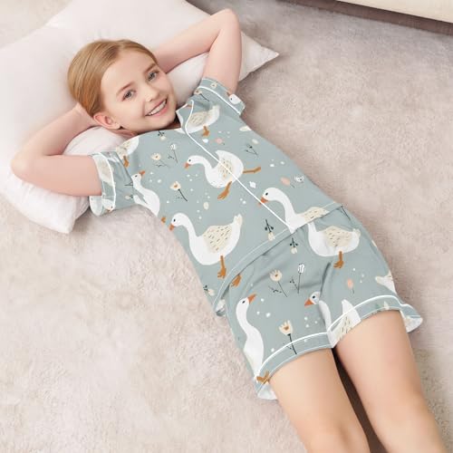 ALAZA White Duck Leaf Blossom Flower Pajamas Satin Pajama Set Short Sleeve Button Down Sleepwear 6