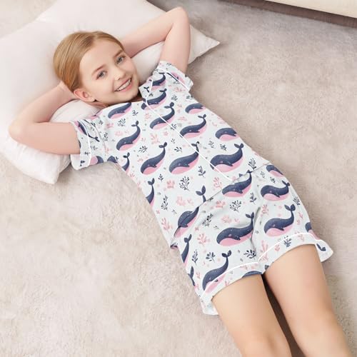 Cute Charming Whale Pattern Summer Satin Pajama Set, Cute Button-Down Sleepwear Pj Set for Sleep Wears 1