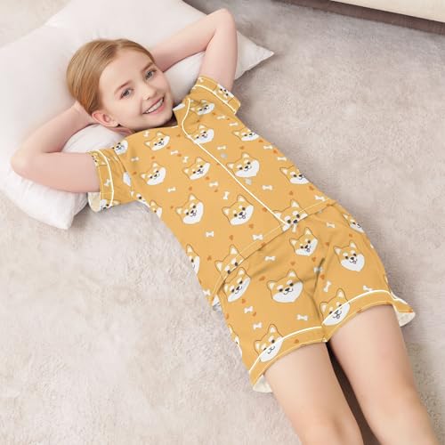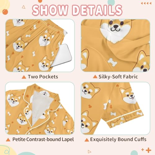 Cute Shiba Inu Pattern Summer Satin Pajama Set, Cute Button-Down Sleepwear Pj Set for Sleep Wears 4