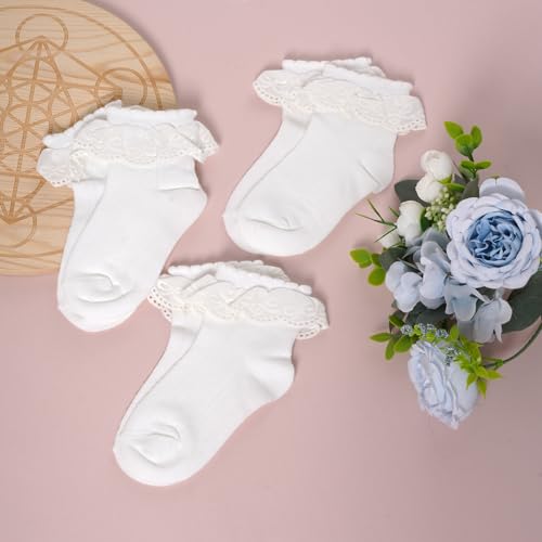 Ishua 3 Pairs Girls Cotton Lace Ruffle Dress Socks, Soft & Comfortable Frilly Style Socks for Little Girls 3