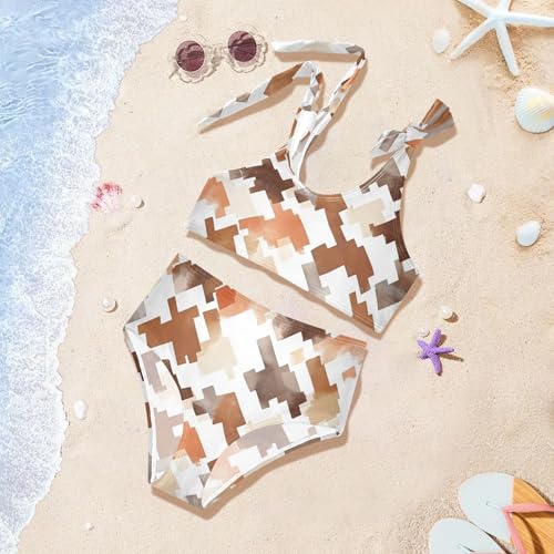 Brown Houndstooth Girls Two Piece Kids Bikini Set Quick-Dry Bathing Suit Swimming Suits Adjustable Shoulder Strap 2