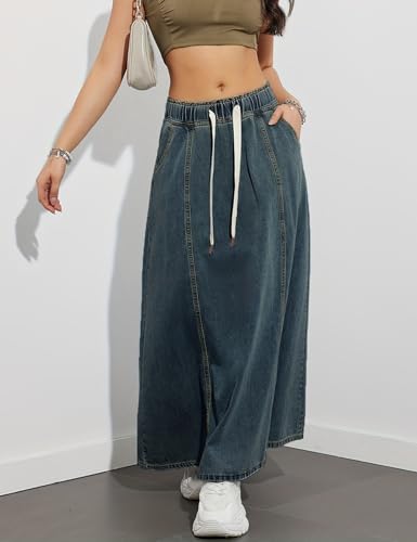 • Feature: Long maxi jean skirt women, features high waisted, elastic waistband with drawstring, a line, loose flowy midi denim skirt, 2 side entry pockets.