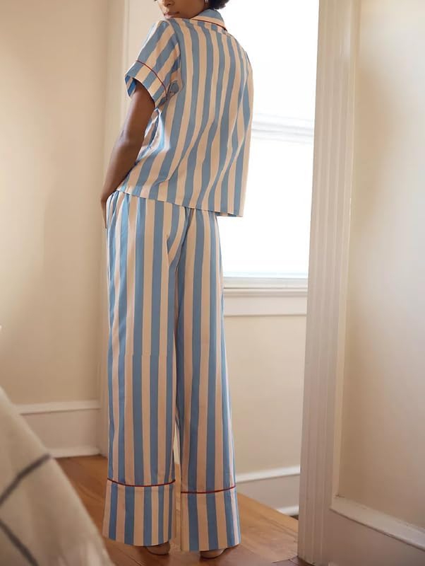 Argeousgor Women Striped 2 Piece Pajama Set Short Sleeve Button Down Blouse Satin Wide Leg Lounge Pants Sets Sleepwear 2