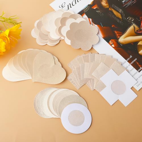 Sibba 4 Styles Nipple Cover Pasties, 80Pcs Disposable Breast Covers Nipple Covers, Self-Adhesive Bra Pad, No Show Satin Breast Petals Stickers for Women Girls Nude 5