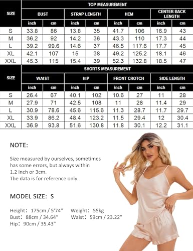 • PERFECT FIT: It’s suitable lounge wear sets for women. The two piece satin tank top pajama shorts feature elastic waist bands which make it easy to put on and take off, fit well without riding up or twisting, and the spaghetti straps can smoothly adjust. Before placing your silk pjs sets for women, please see the detailed sizing information of women's short silk satin pajamas set in the product description.
