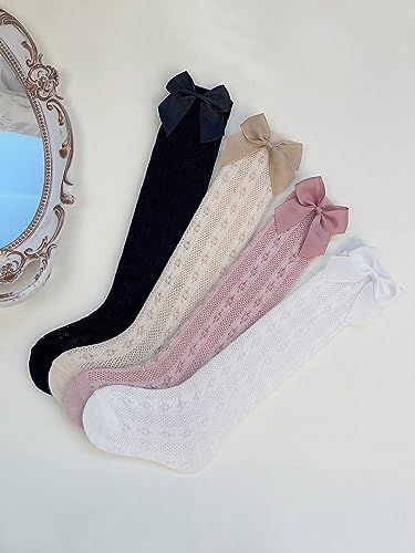OYOANGLE Girl's 4 Pairs Cute Ruffle Knee High Socks Bow Front Over the Calf Socks Beige Pink 2-3Y 6
