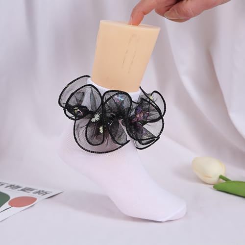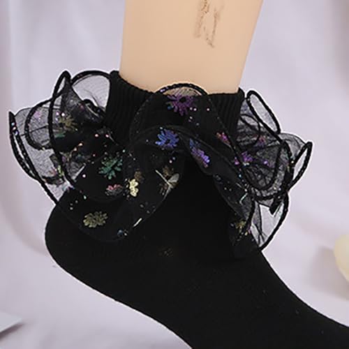 2 Pairs Glitter Flower Ruffle Double Layer Lace Princess Socks Casual Comfy Frilly Dress Ankle Socks Cute Soft Crew Socks 7