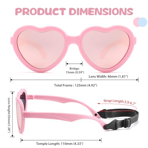 • KID-FRIENDLY DESIGN: The heart-shaped sunglasses are designed specifically for toddlers and kids up to 8 years old, with an adjustable elastic strap and flexible rubber frames that provide maximum comfort and safety.