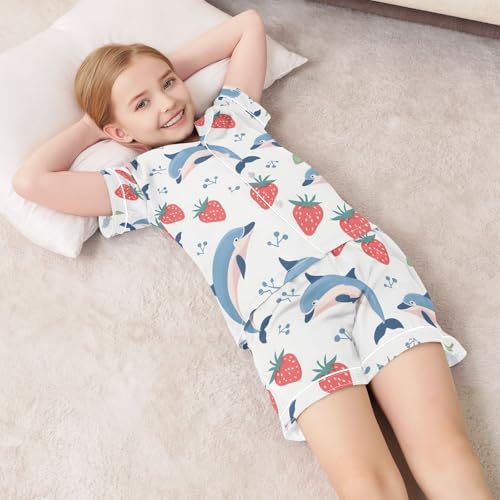 HOT ! ALAZA Cute Dolphin Strawberry Pajamas Satin Pajama Set Short Sleeve Button Down Sleepwear