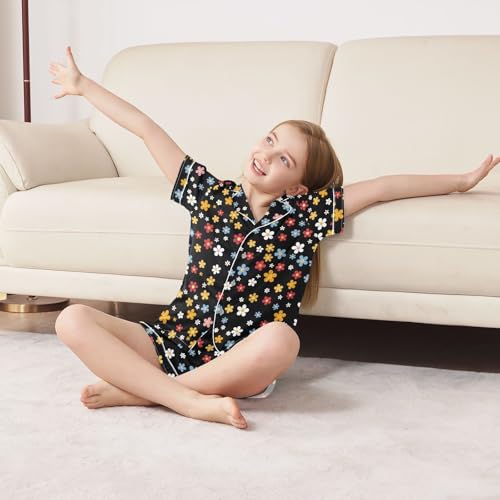 ALAZA Cartoon Flower Blossom Print Satin Pajamas Set Short Sleeve Button Down Sleepwear Summer Pjs 2 Piece 7