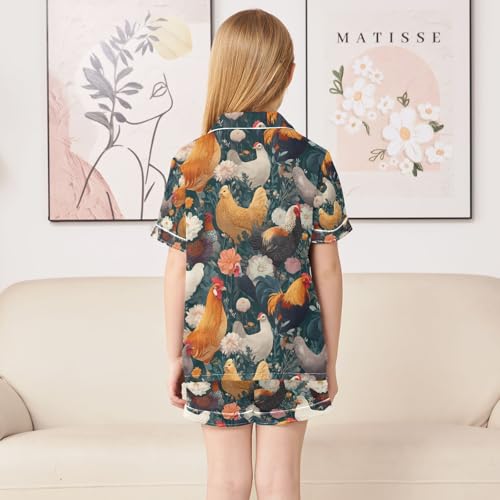 senya Rooster Hen Flowers Satin Summer Pajama Sets Silk Short Sleeve Button Down Sleepwear 1