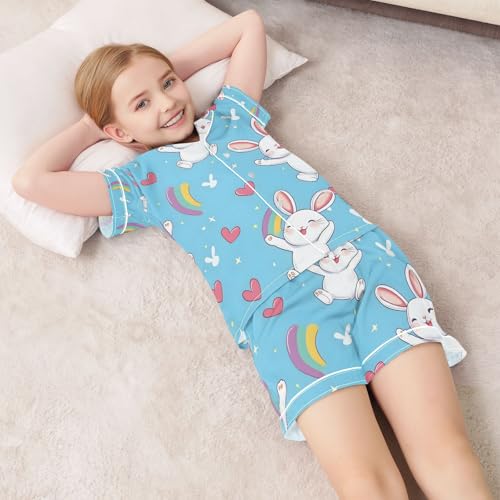 senya Rabbit Rainbow Happy Satin Summer Pajama Sets Silk Short Sleeve Button Down Sleepwear 1