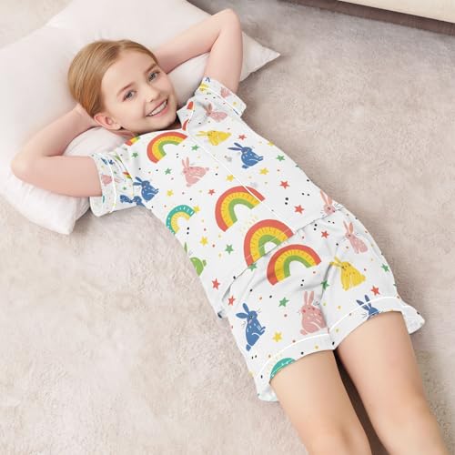 HOT ! senya Cloorful Rabbit with Rainbow Satin Summer Pajama Sets Silk Short Sleeve Button Down Sleepwear