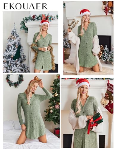 HOT ! Ekouaer Nightgowns for Women Button Down Night Shirt Long Sleeve Ribbed Knit V-Neck Sleepwear Pajama Dress