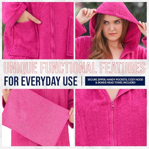 • ⭐ PERFECT DESIGN - Adult dressing gown is designed with an easy-glide zip and two large side pockets at the front ideal for men & women. The large hood of the towel robe ensures protection against sun, rain and wind.