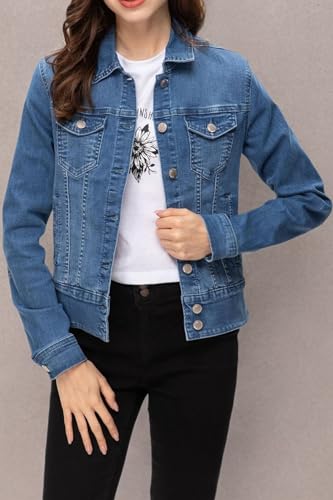 HOT ! FASHIONSPARK Women's Basic Button Down Denim Jacket, Casual Long Sleeve Fitted Jean Jacket with Pockets