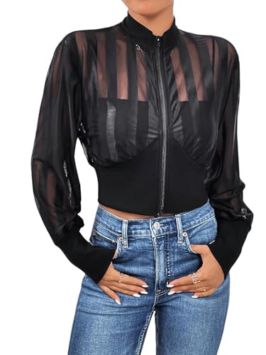 • Feature: Long Sleeve, Mock Neck, Semi Sheer, Zip Up, Fashion Crop Jackets for Women
