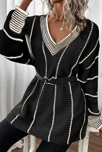 More information about Women's Colorblock Black Striped V Neck Knitted Loose Sweater