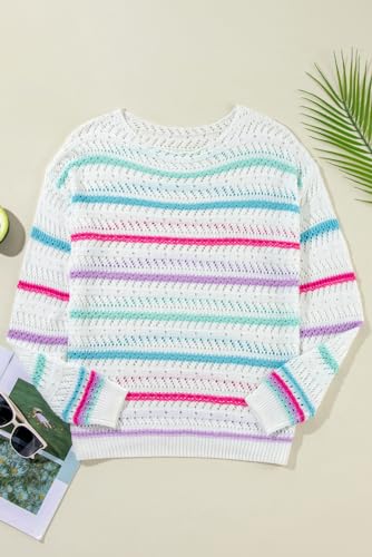 • 4. [Versatile Vogue] : Our White Stripe Hollowed Crochet Loose Fit Sweater is the perfect mix of style and comfort. The trendy striped design and comfortable long sleeves make this sweater suitable for a variety of occasions, from casual outings to more relaxed events.