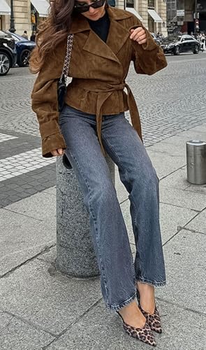 • Versatile Faux Suede Jacket: 2025 fall fashion crop leather jacket for outing; Elegant wrapped short faux suede jacket with belt for women business causal work outfits;Vintage cowgirl brown vegan leather jacket for casual petite coat; Women fall winter travel outfits faux suede leather jacket; Sophisticated short trench coat petite coat for winter casual outwear
